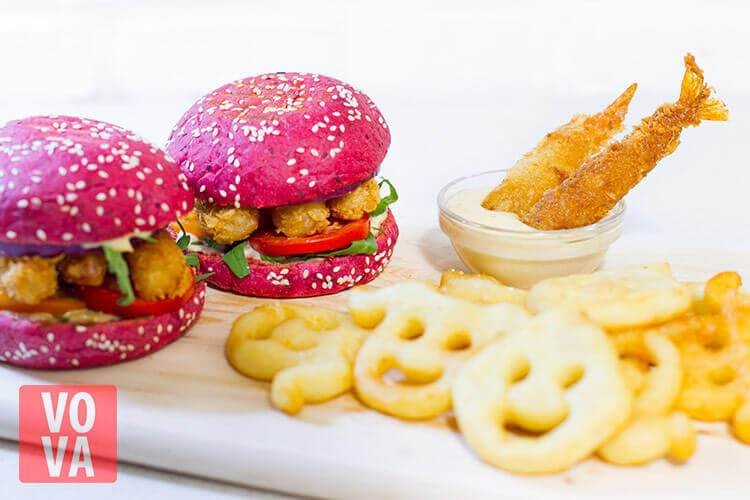 Когда все составляющие приготовлены, можно “собирать” наш бургер с креветками. Делаем это в следующей последовательности (сверху вниз):